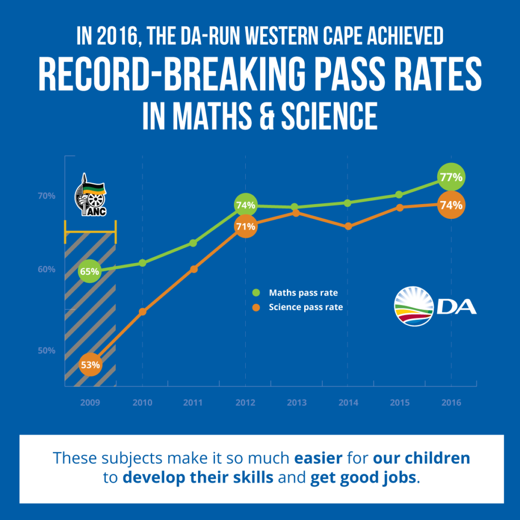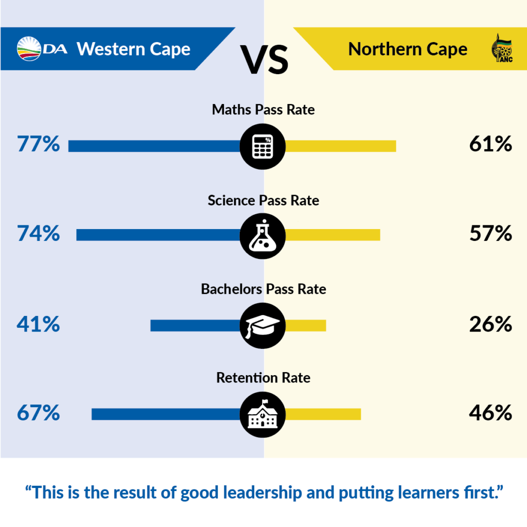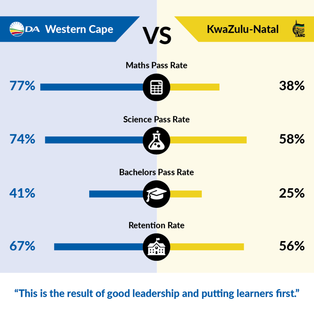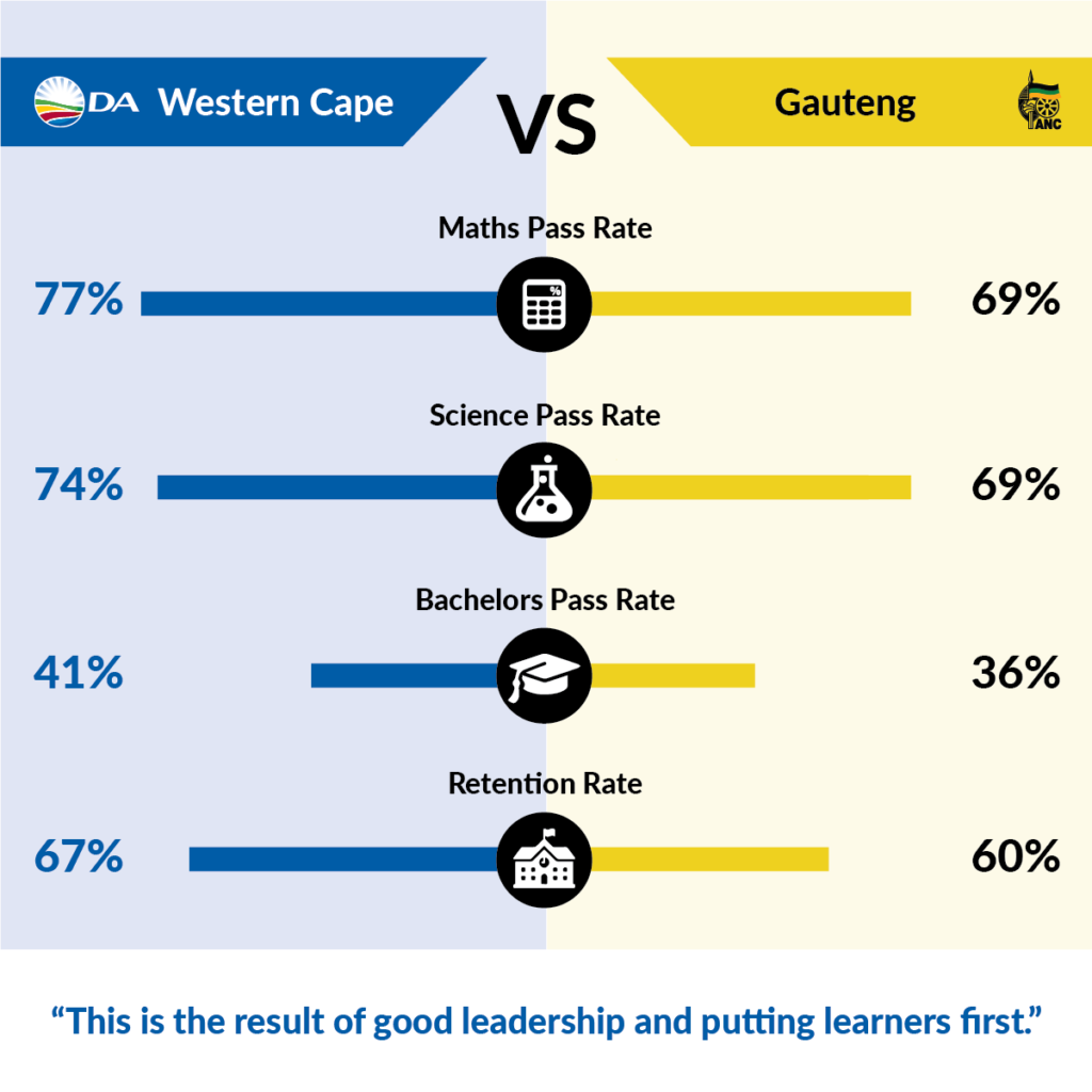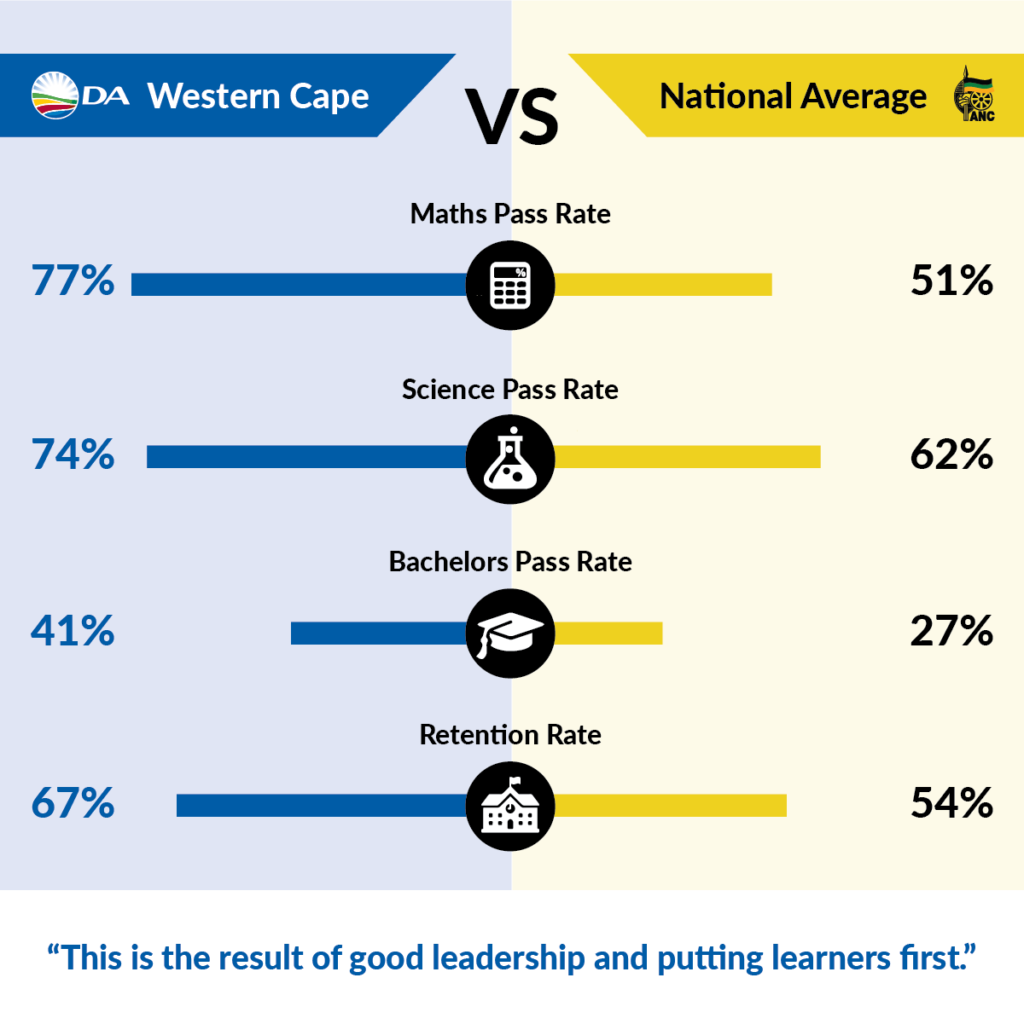 - Boasts the highest Bachelor’s pass rate in SA; more learners qualify for university in the DA-led Western Cape than in any other province.