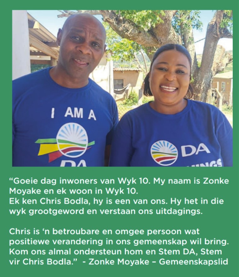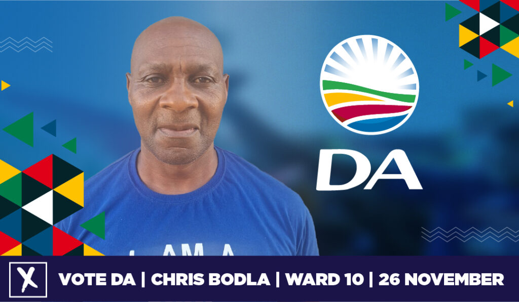 Chris, as die DA se kandidaat vir Wyk 10, staan vir eerlike leierskap en verantwoordbare dienslewering.