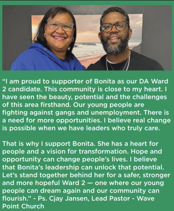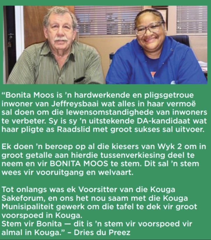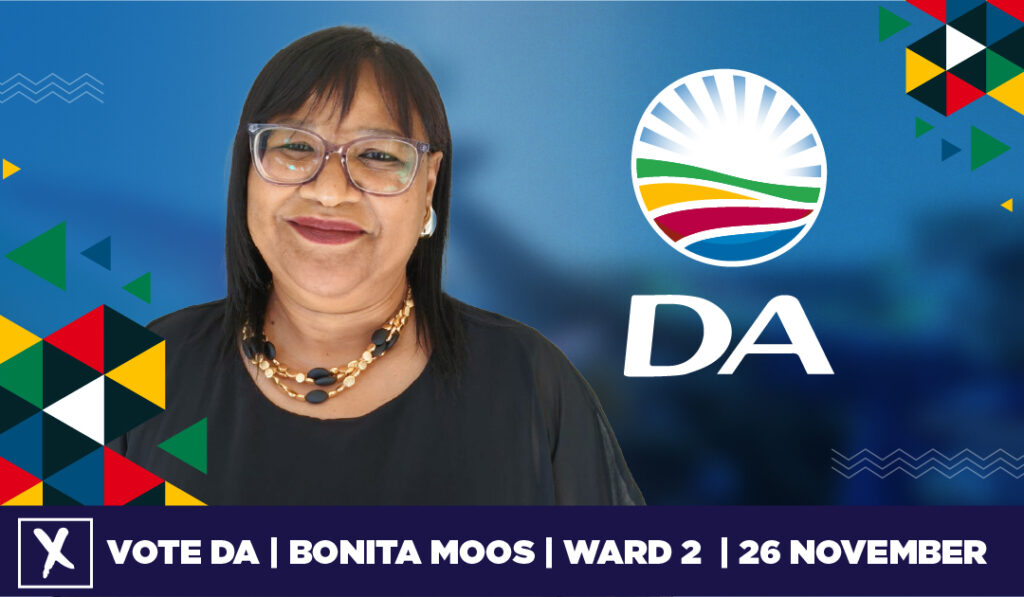 My name is Bonita Moos. Aston Bay and Pellsrus have been my home for the past 23 years. I have been involved with Kouga Municipality since 2019. I started as a litter picker — with my safety boots and blue overalls. In 2021, I was appointed as Ward Assistant for Ward 2, where I learned what really matters to our people.