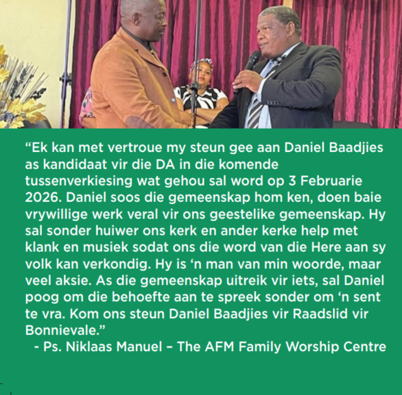 “Ek het gekies om by die DA aan te sluit om my gemeenskap te dien met ‘n party wat weet hoe om goed te regeer. Ek het die besluit vir Bonnievale geneem en nie vir Daniel nie. Ek vertrou dat die inwoners van Bonnievale my weer in die komende tussenverkiesing op 3 Februarie 2026 sal ondersteun.”